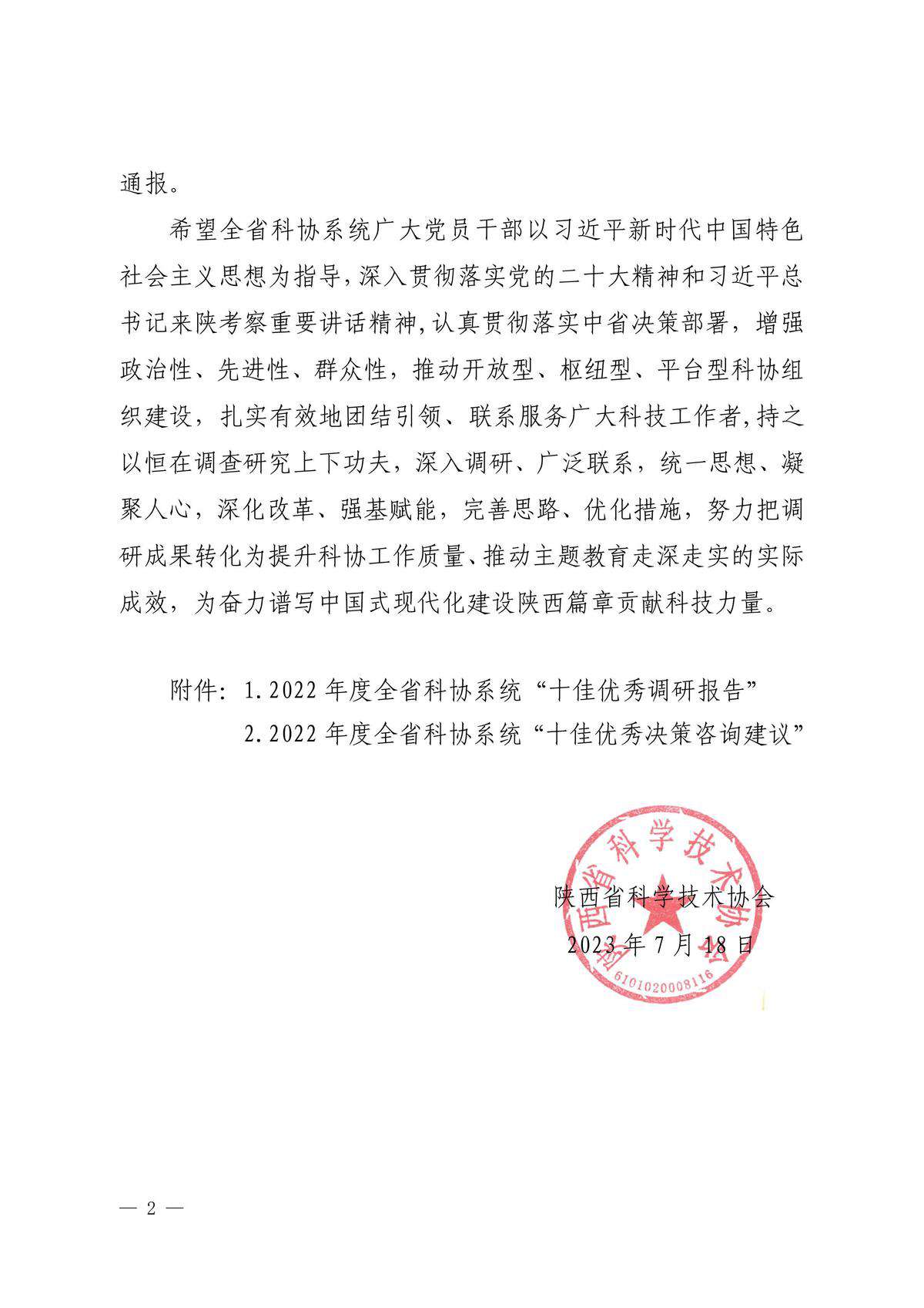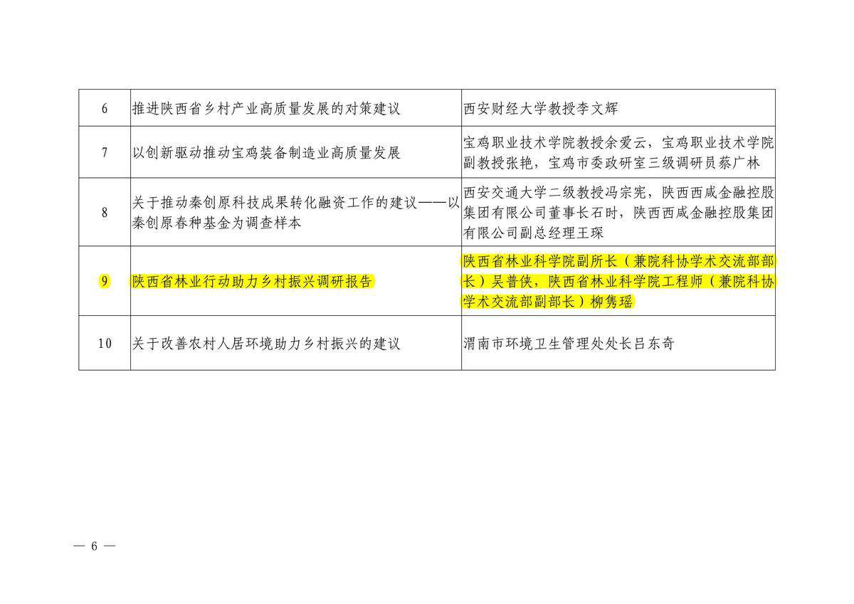 近日,陕西省科学技术协会印发了《关于公布2022年度全省科协系统“双十”优秀调研成果的通报》(陕科协发〔2023〕规字7号)。其中,由我院生态所吴普侠、柳隽瑶同志撰写的《陕西省林业行动助力乡村振兴调研报告》荣获2022年度全省科协系统“十佳优秀决策咨询建议”。该报告主要依托陕西省哲学社会科学研究专项“乡村振兴视域下陕西秦巴山片社区林业发展机制研究(2022HZ1745)完成。
